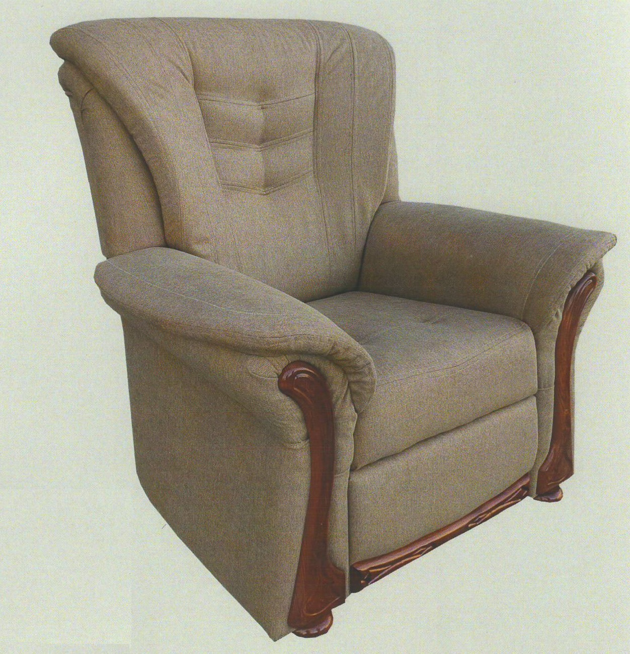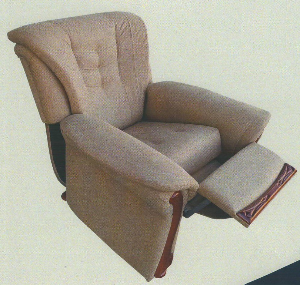 Magas komfortfokozatú fotel, lábkiemelős billenthető támlával, díszítő fabetétjeit a kívánt színre pácoljuk.