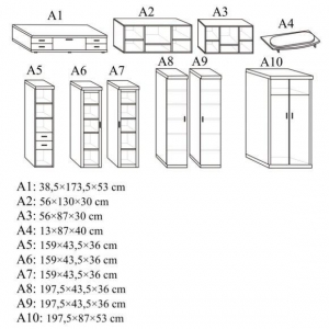 A szekrénysor méretei :333.5x 197×53/36 cm